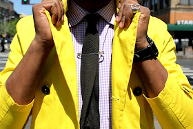 Yellow Rain Coat: Zara Micro Fiber Square off tie: Forever 21 Lavendar & White gingham plaid shirt: La'Tigre